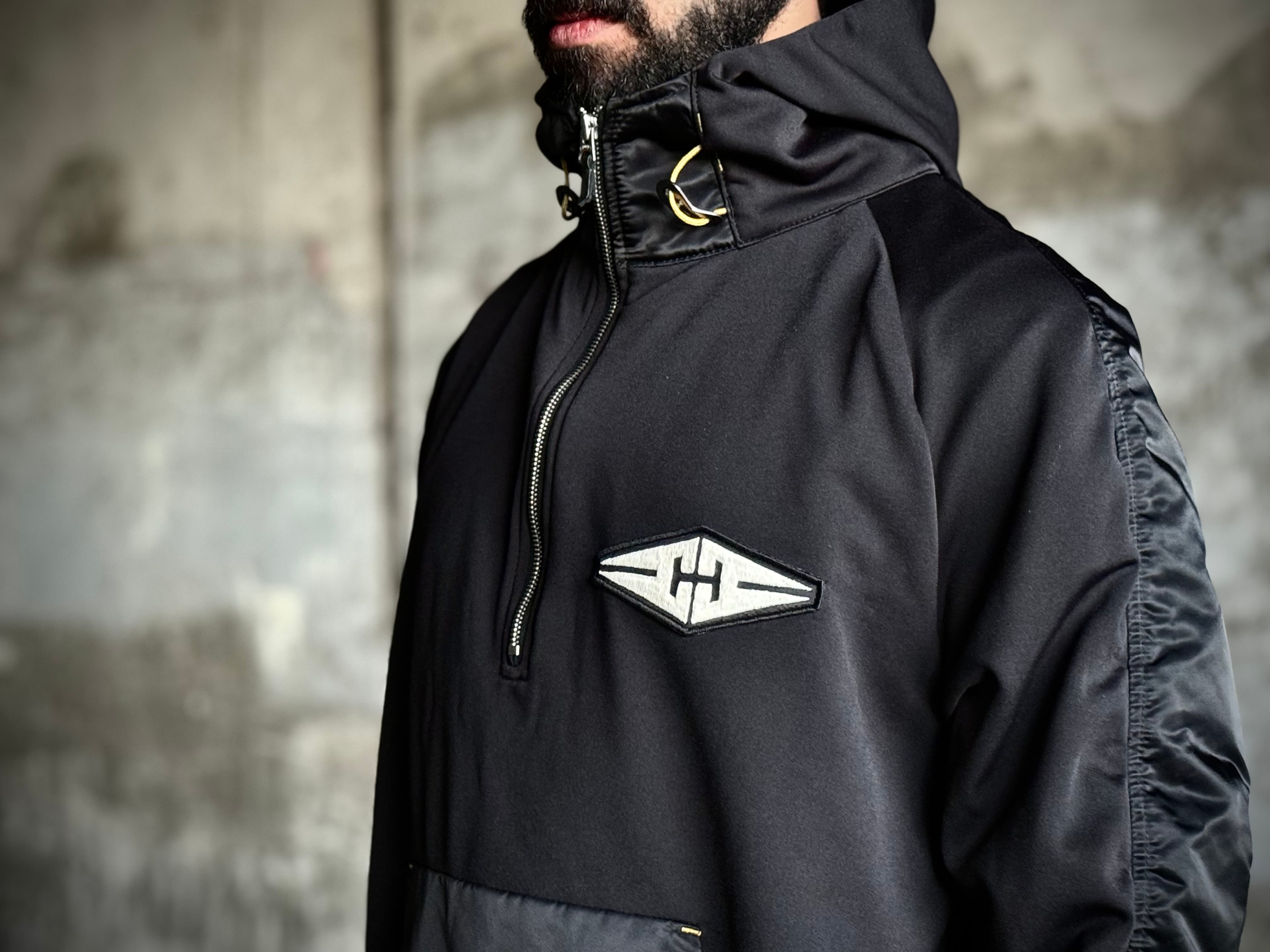作品説明 : Pe80%、Ny16%、Pu4%で構成されたコーデュラフリースを使用したハーフジップパーカーになります。