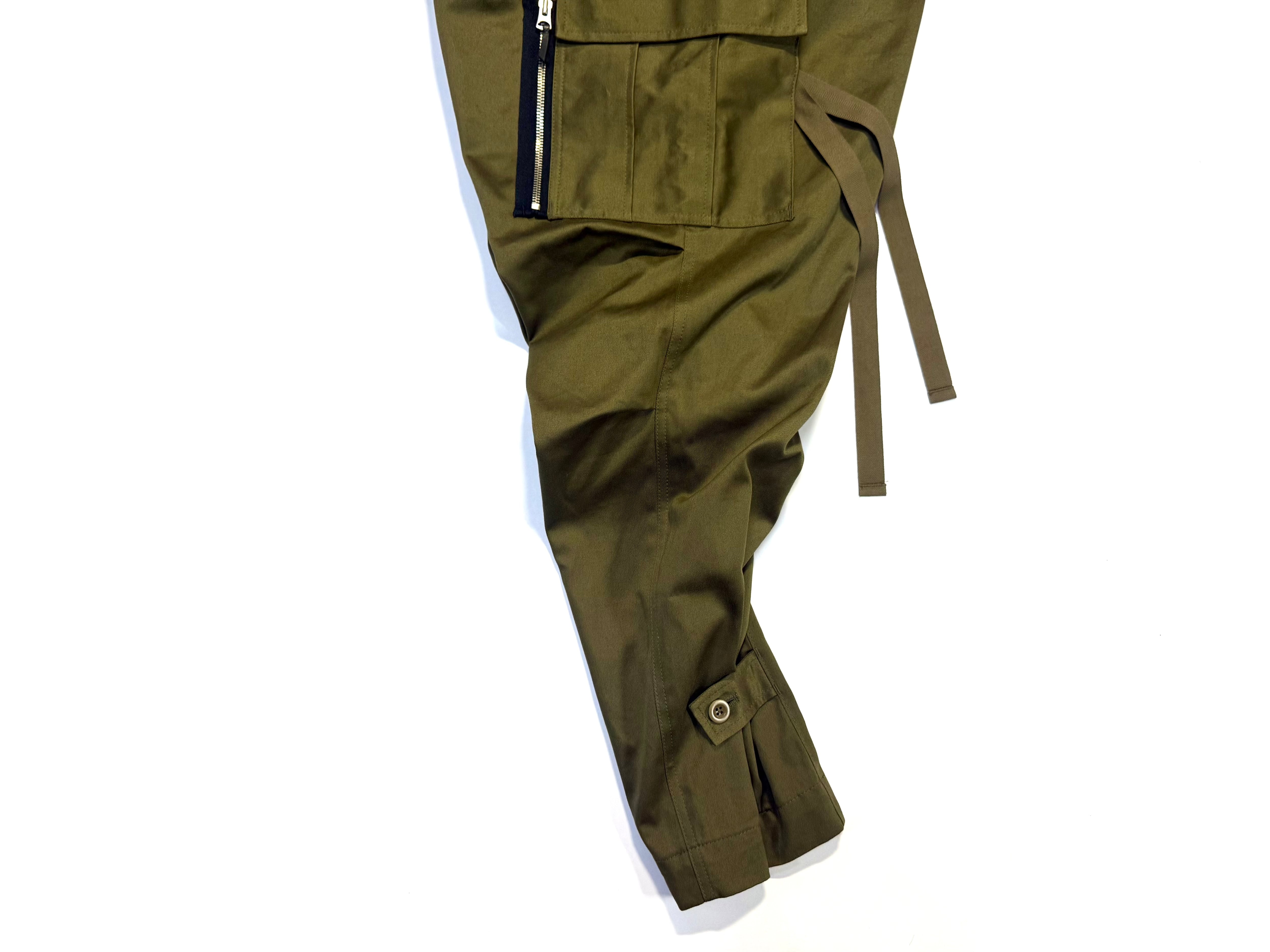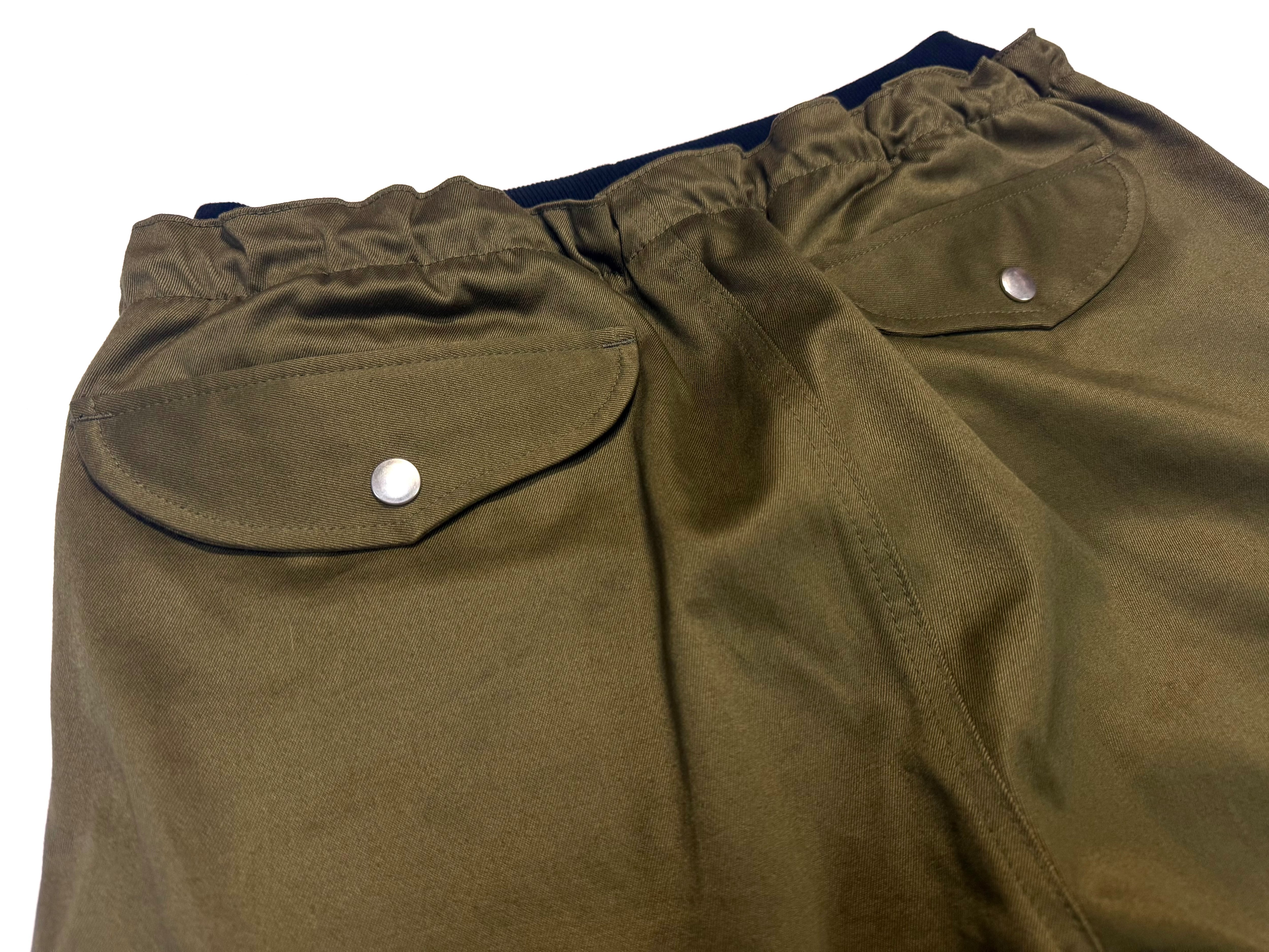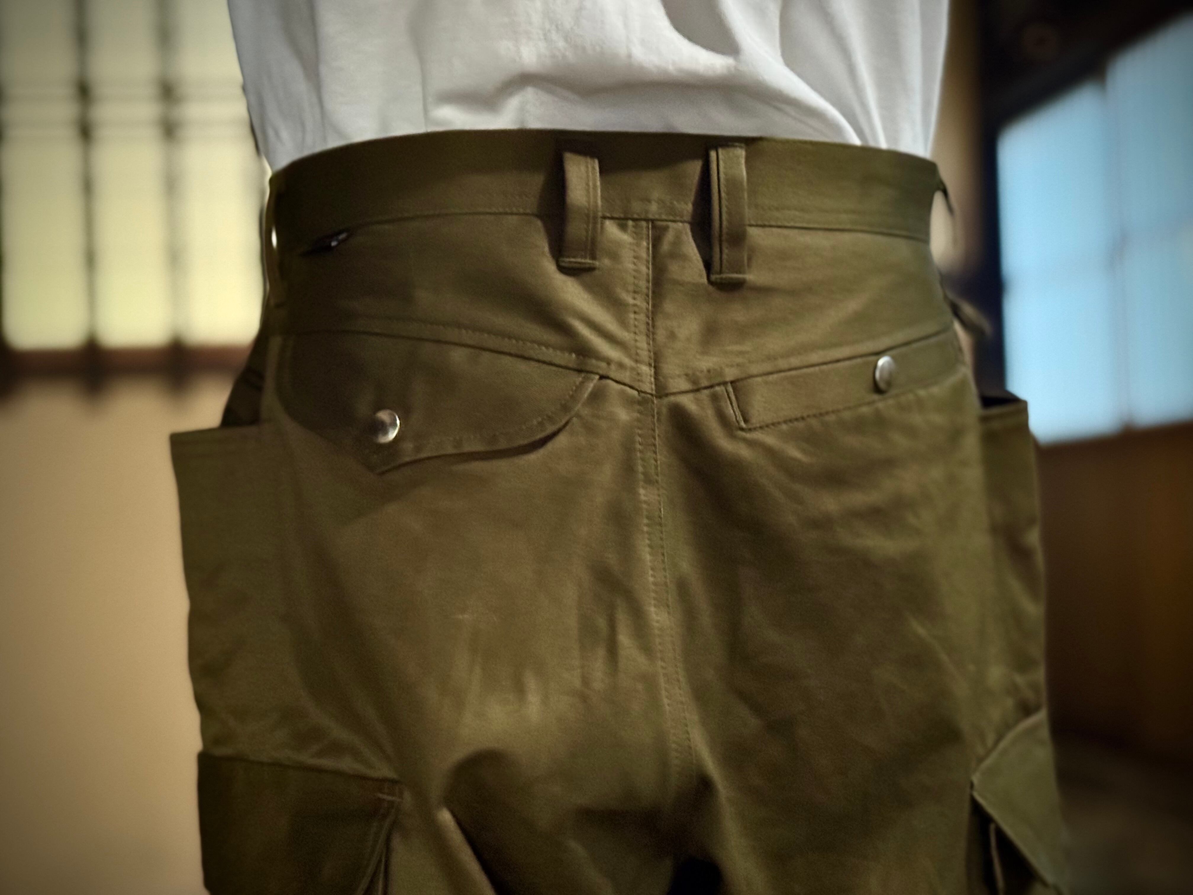 カーゴポケットは通常よりマチを多めに取っているので大容量収納ができ、左はファスナー付きなので座った時上から中身が取り出されるように設計、右は物が落ちないようにフラップの端を開かない様にカンドメで止めてあります。