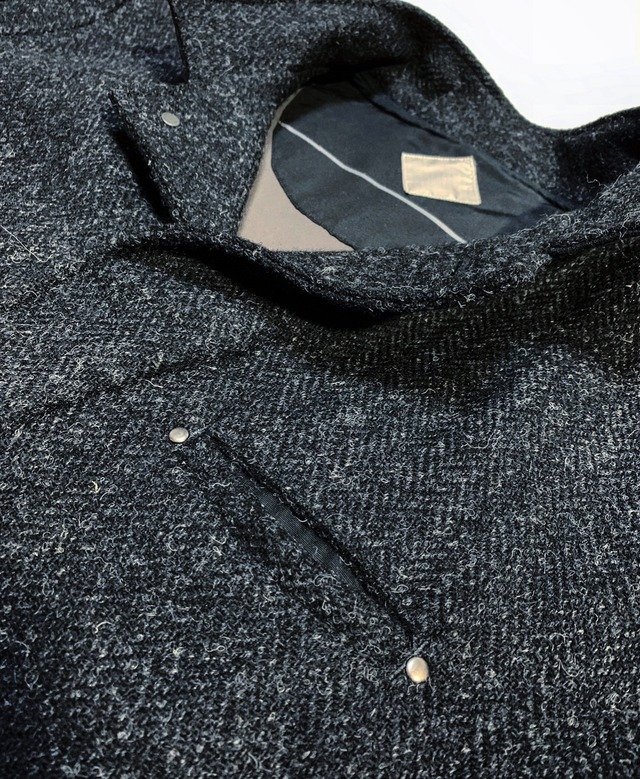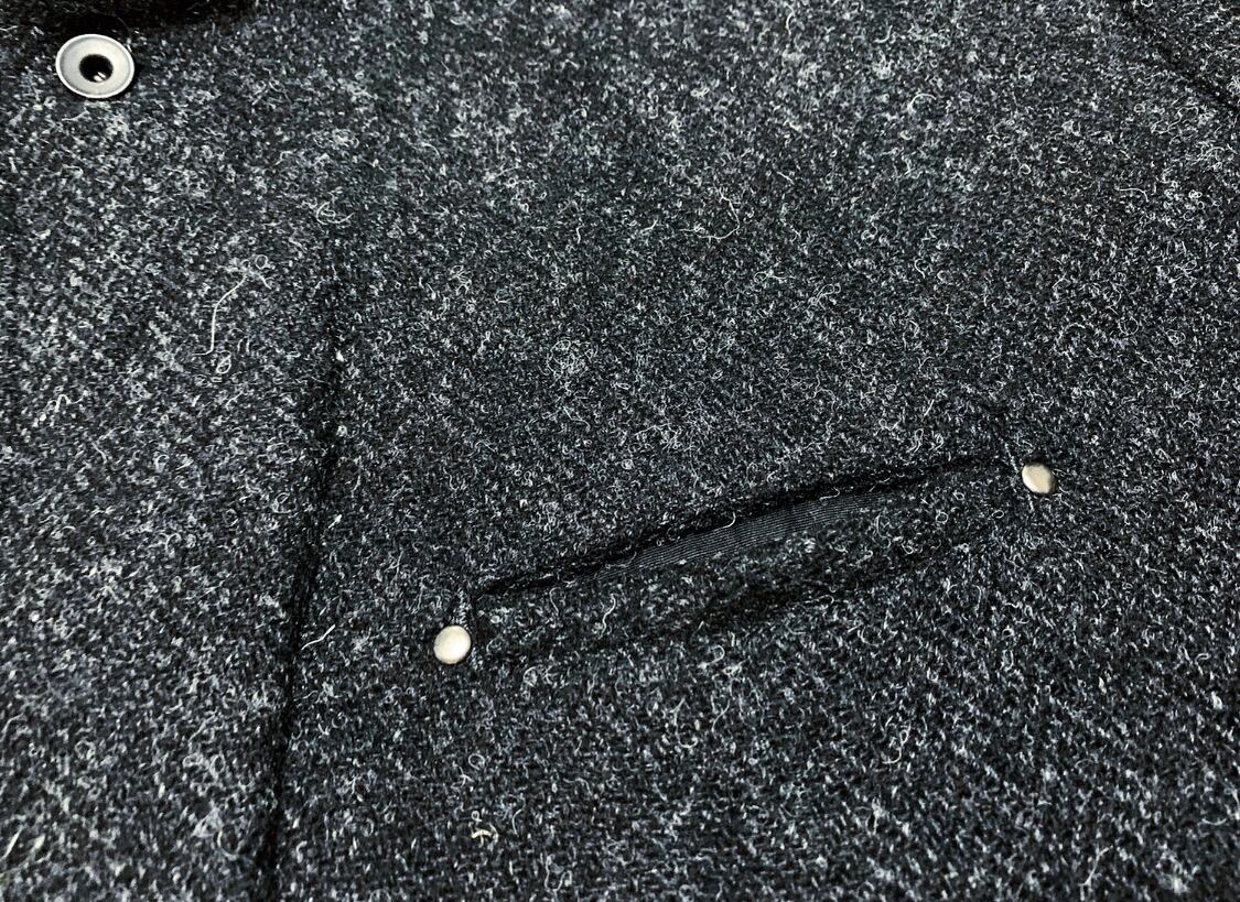 フロントのボタンは敢えて隠しドット釦を採用し陰影を少なくツイードに包まれるようなディティールに仕上げてます。