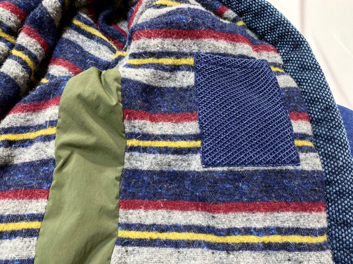 前タテ部分と脇のつなぎ、肘当てに刺し子インディゴ生地を使用し、裏地には脇部分に防水加工ストレッチ綿ナイロン生地を使用する事で着易さを追求しました。