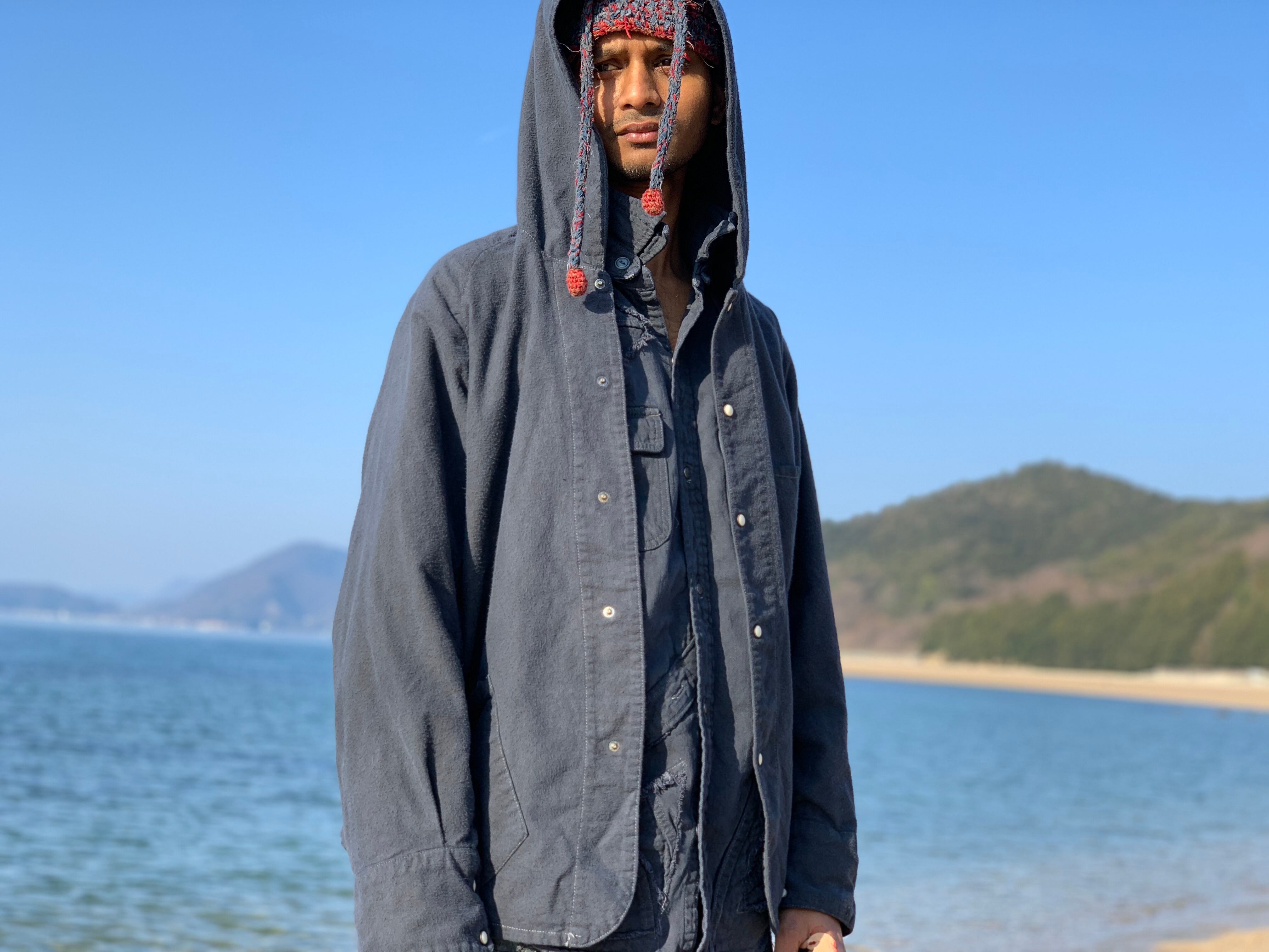 Leeのカバーオール型を原型にフード付き仕様にし、後ろ身頃に無数のタックを取る事で可動域を多く設けた独自のカバーオールを縫い上げた後、昔古着屋でよく見かけたビックマックネルシャツの起毛感を求め何度もボールやストーンでの加工を繰り返し、仕上げに硫化染で赤みを排除し、青みを多く含んだ墨黒硫化染料で独自の世界観を表現しました。