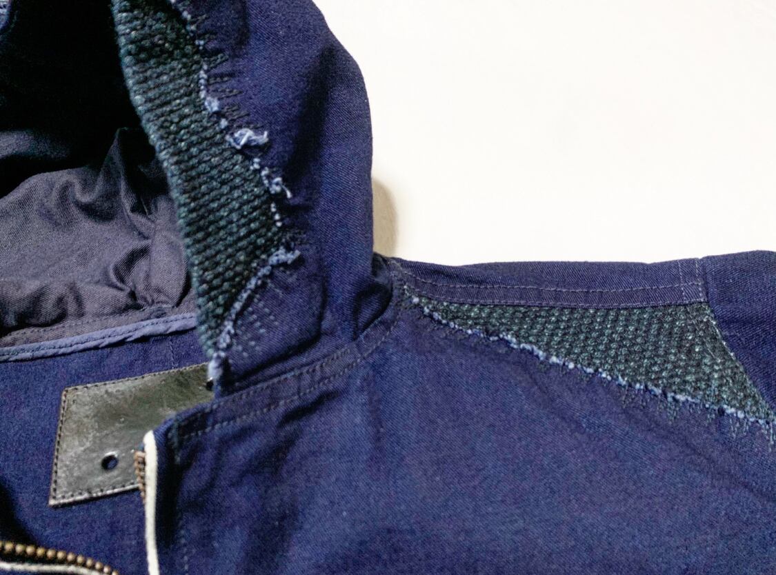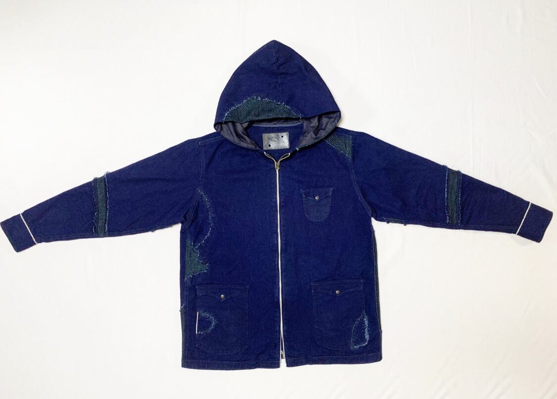 商品説明 : 先染めインディゴ糸で織り成したツイル生地をベースにインディゴ刺し子生地を縫い繋ぎダメージを落とし込んだフーディージャケットとなります。