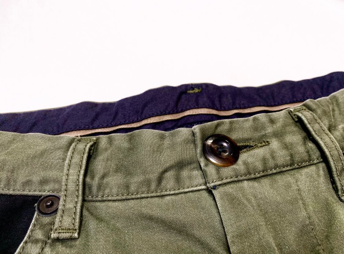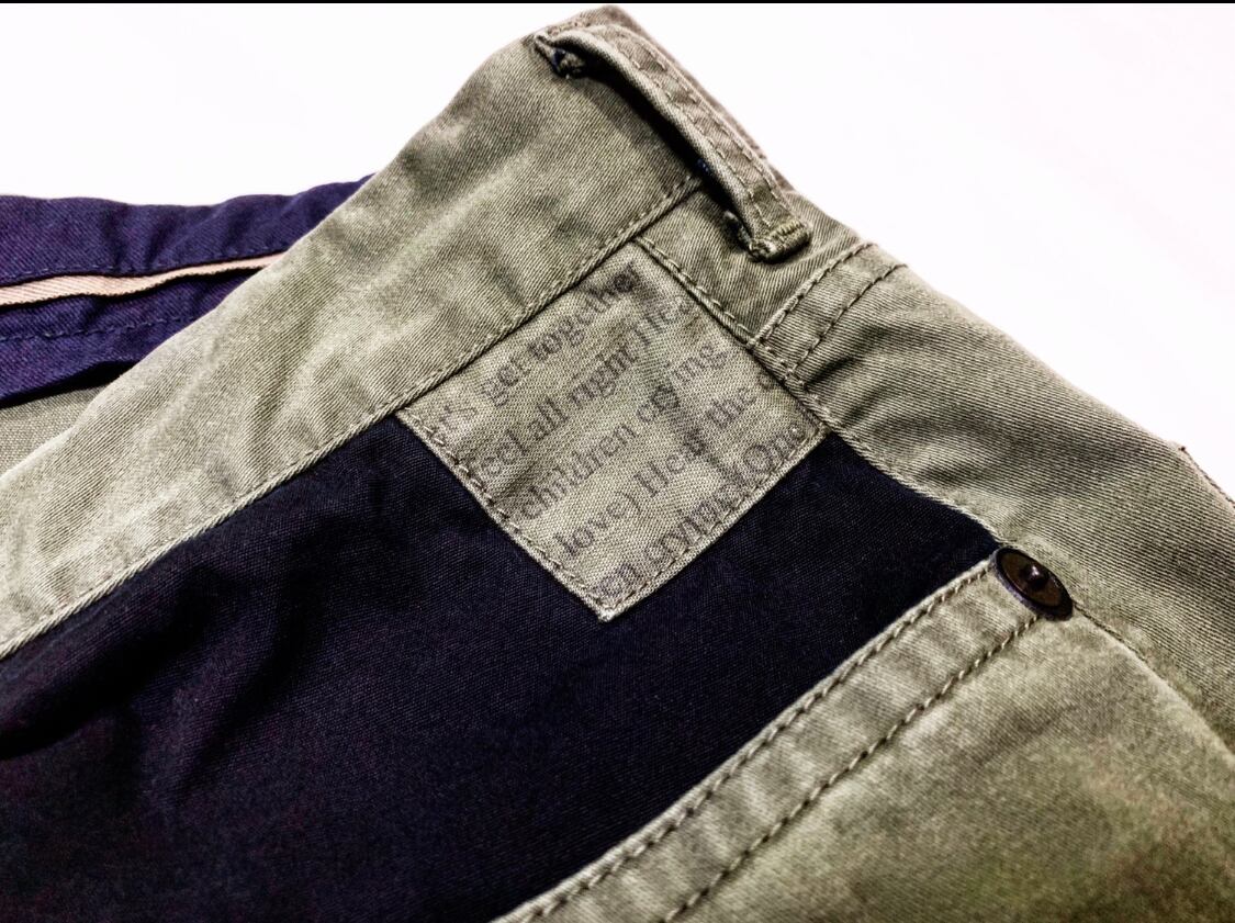 腰裏はマーベルト仕様でウエストにフィットするように設計しており、膝の開閉部分には別布で刺し子生地を使用しております。