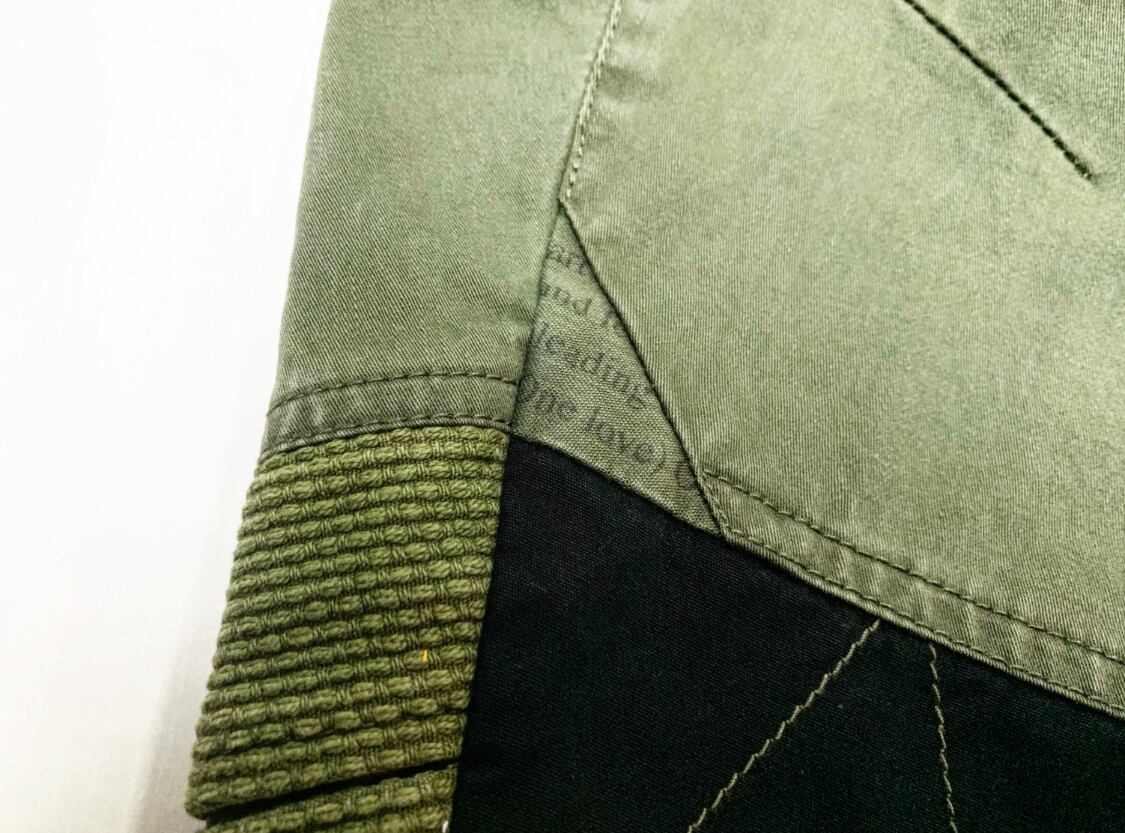 脇ポケットはゆとりのあるラウンドさせた形にこだわり、太腿部分にかなり余裕を持たせ膝部分に可動域を持たせるためバイアスで裁断したパーツを組み合わせ、別布で開閉できる仕様にしました。