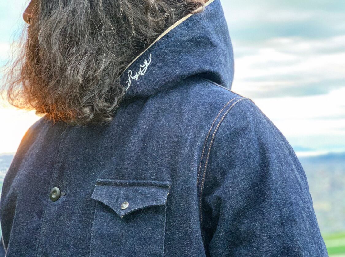 Product Description: N-1 deck jacket with hood using 14.5 ounces of selvedge denim.