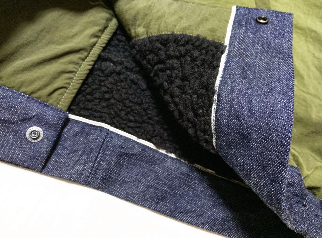裏地は身頃にポリエステル65% アクリル35%のボアを、袖には中綿キルティングを使用しております。