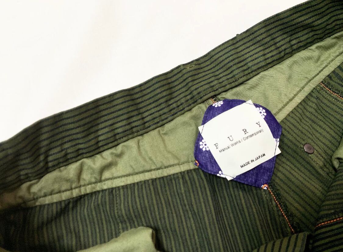 商品説明 : 幅、規格の番う3種類のインディゴストライプ生地を組み合わせたFURY独自のニッカーボッカーズショートパンツになります。