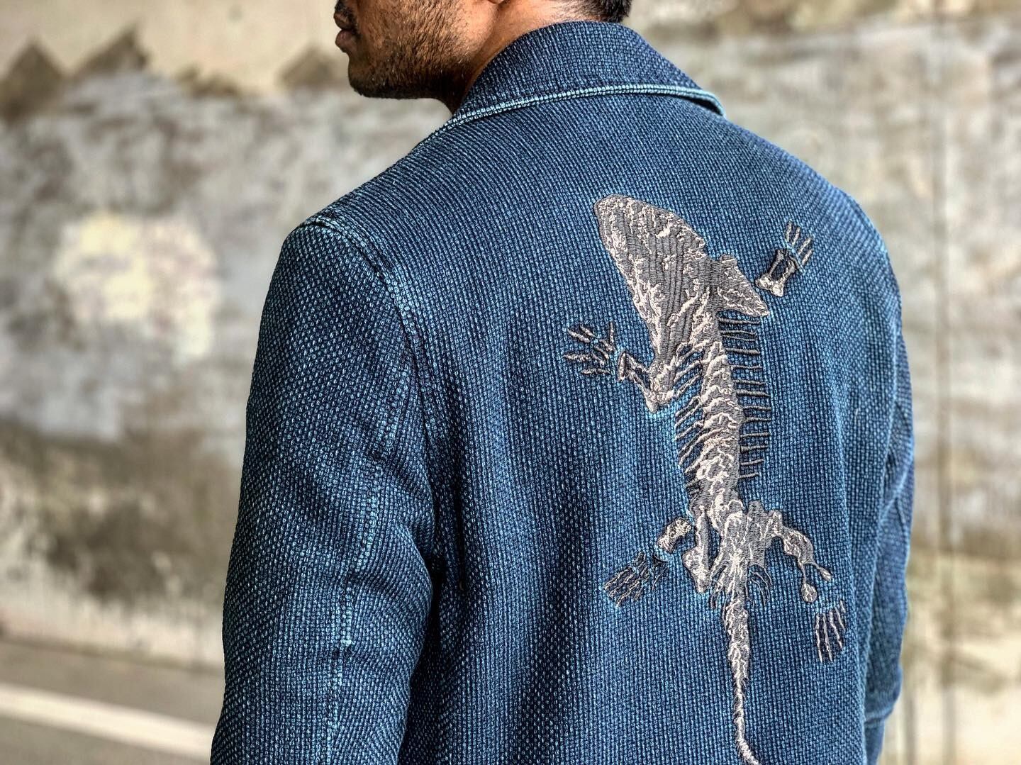 背中には広島県最後の横振り刺繍職人《山下忠男》氏の渾身の大作【イクチオステガ(約3億6700万年前に生息していた原子四股動物)】の骨の化石を入れて頂きました。