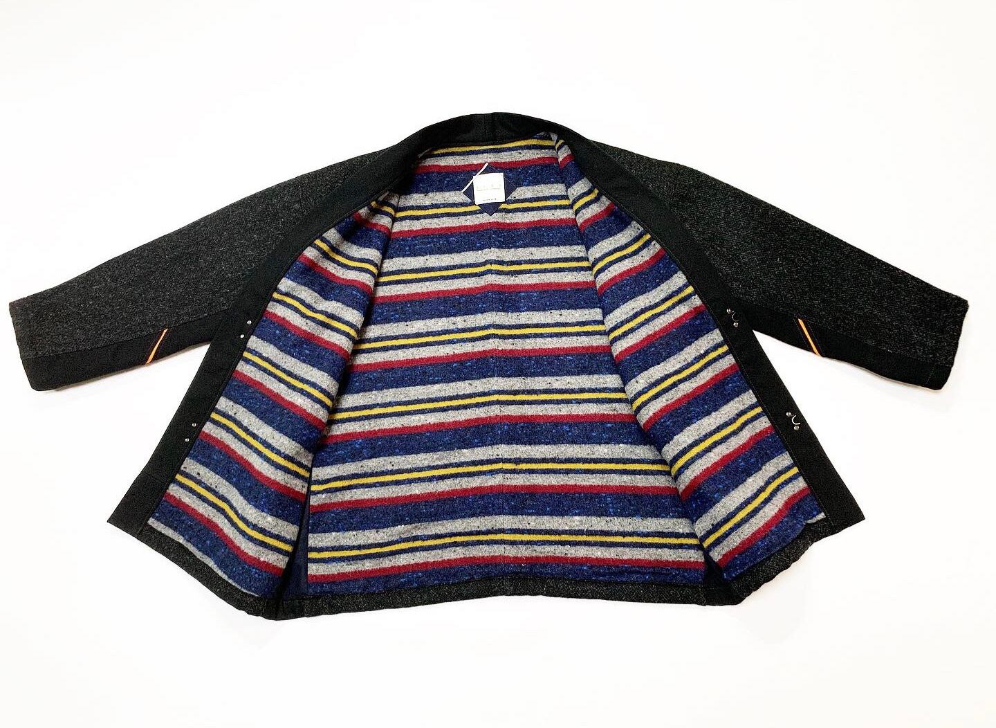 裏地にはデッドストックガラ紡生地を使用し袖底には滑りのいい高密度織りの麻生地し着脱をスムーズに行えるように構成しております。