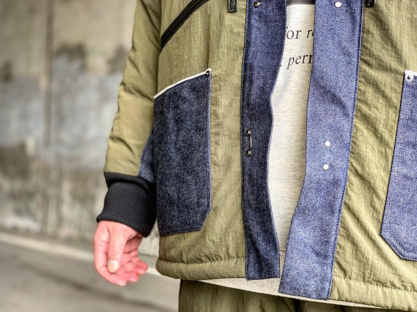 The placket belt, pockets, and side parts are made of water-delivered selvedge denim, and awakening orange fabric is combined to create warmth and accent color.