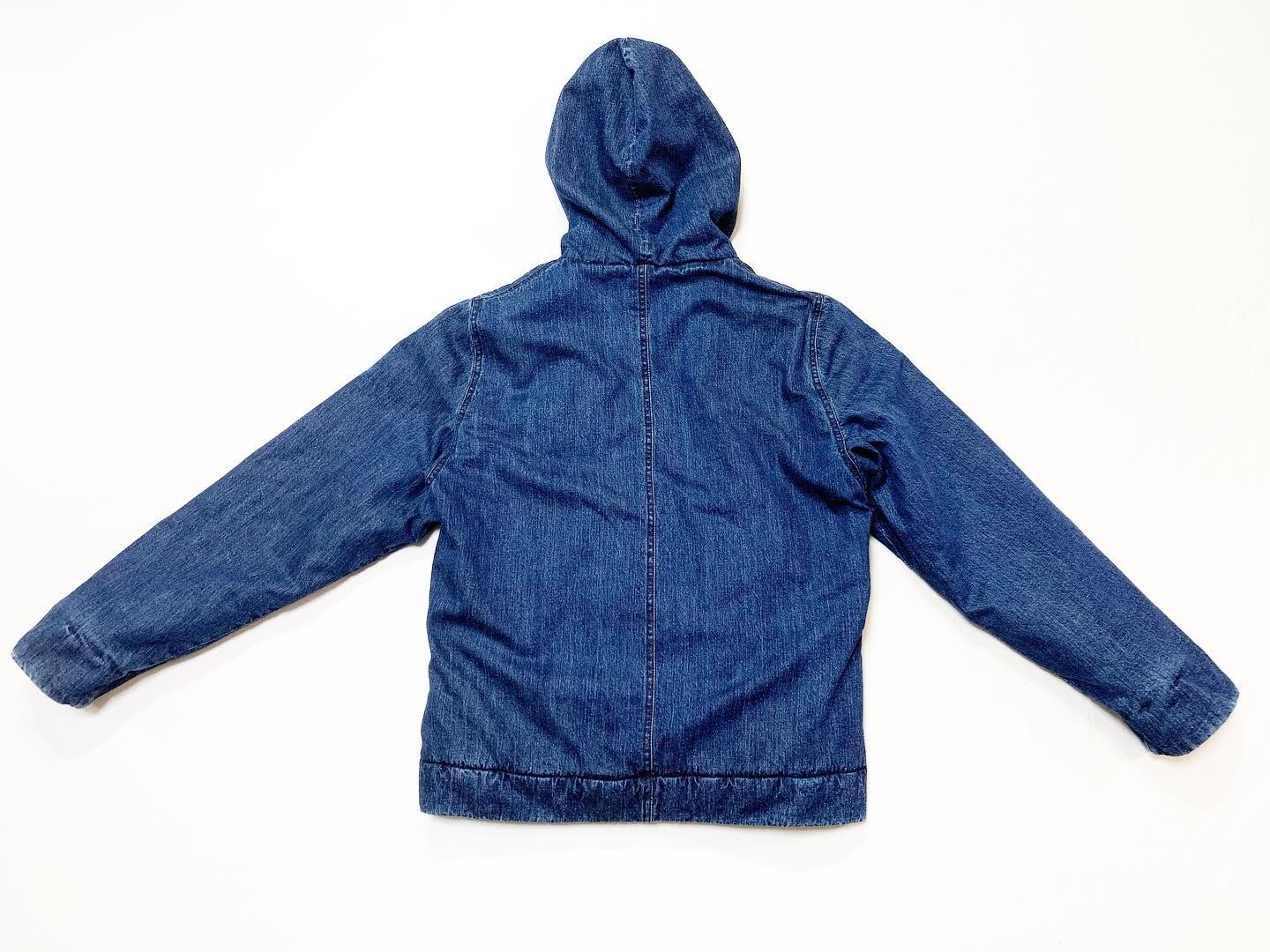 Product description: This is a hooded N-1 deck jacket made from 100% cotton 9-ounce Nep-blend indigo denim.