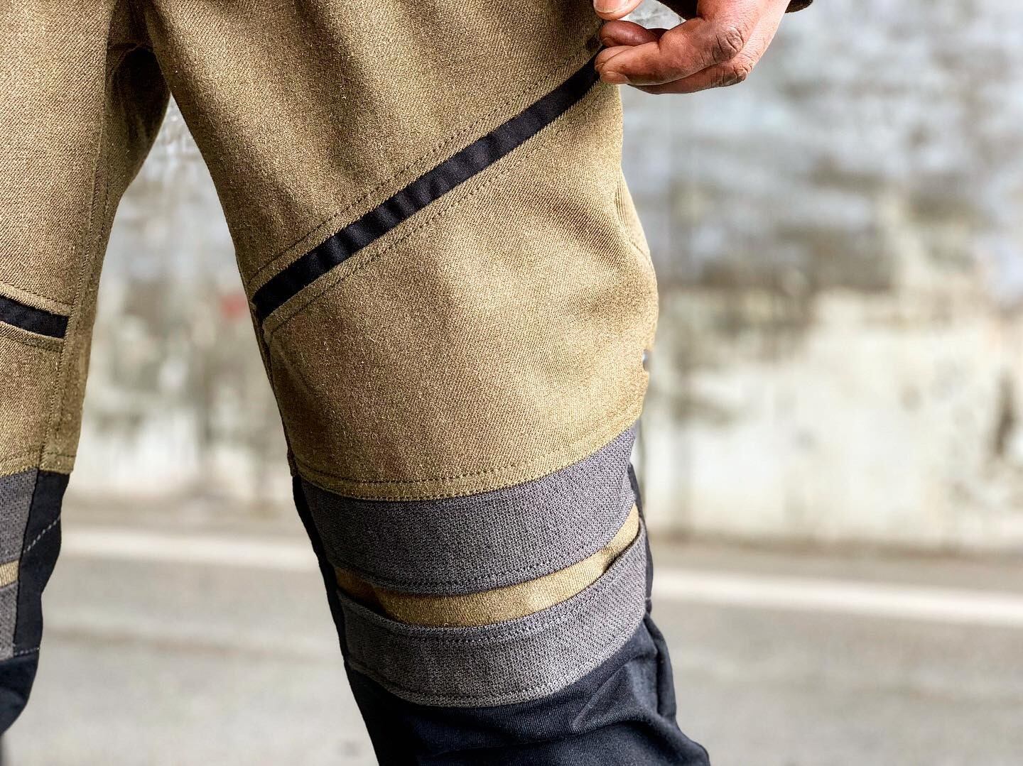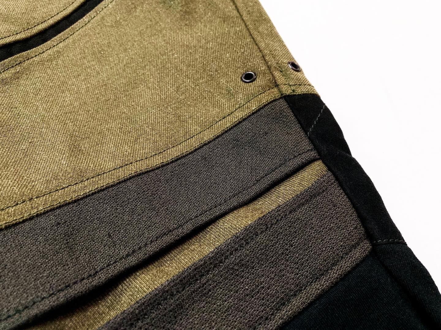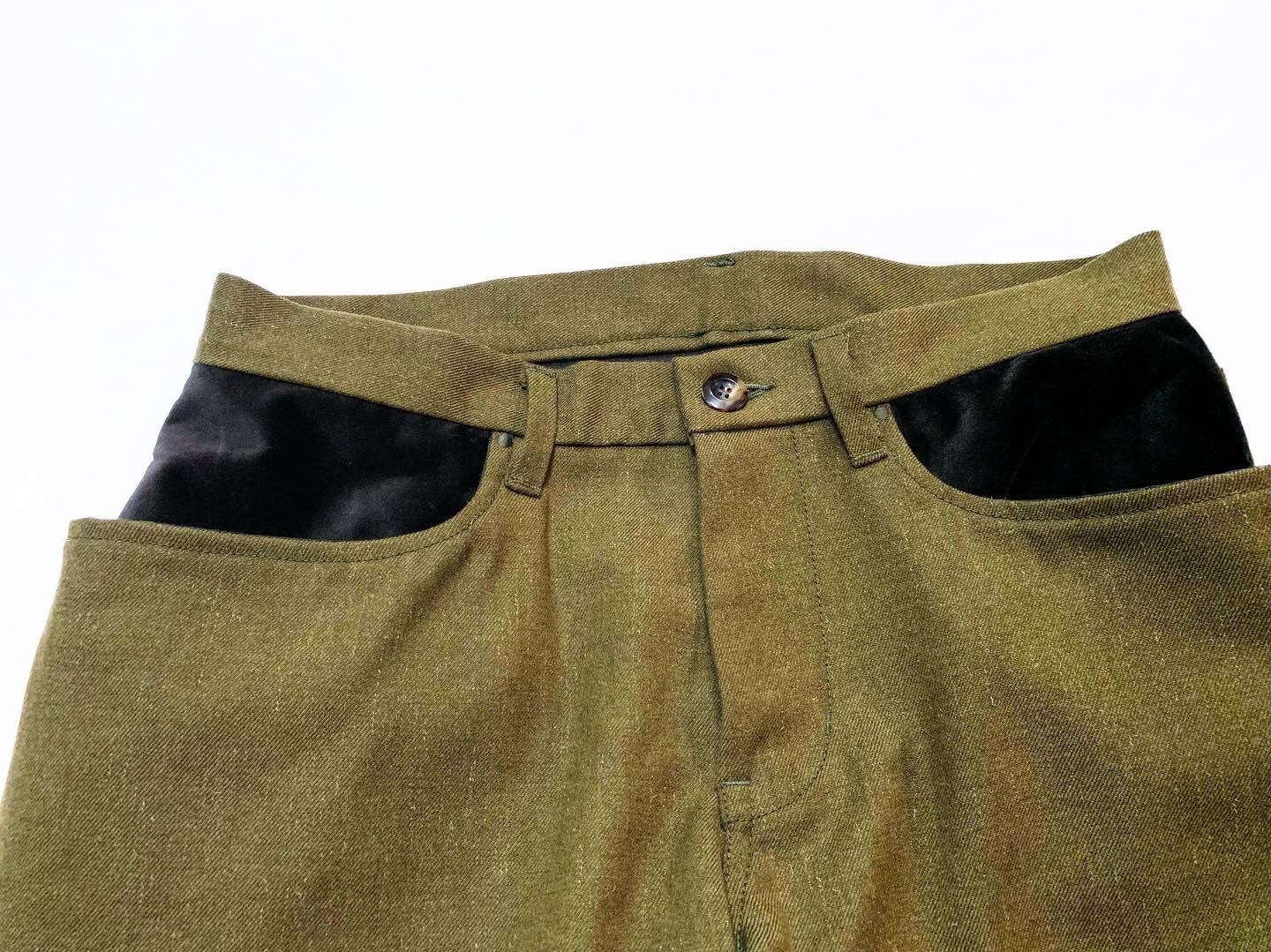 ポケット向こう布にはベルベット素材、膝部分と後ヨーク部分には甘織りの固仕上げされた麻生地を組み合わせました。