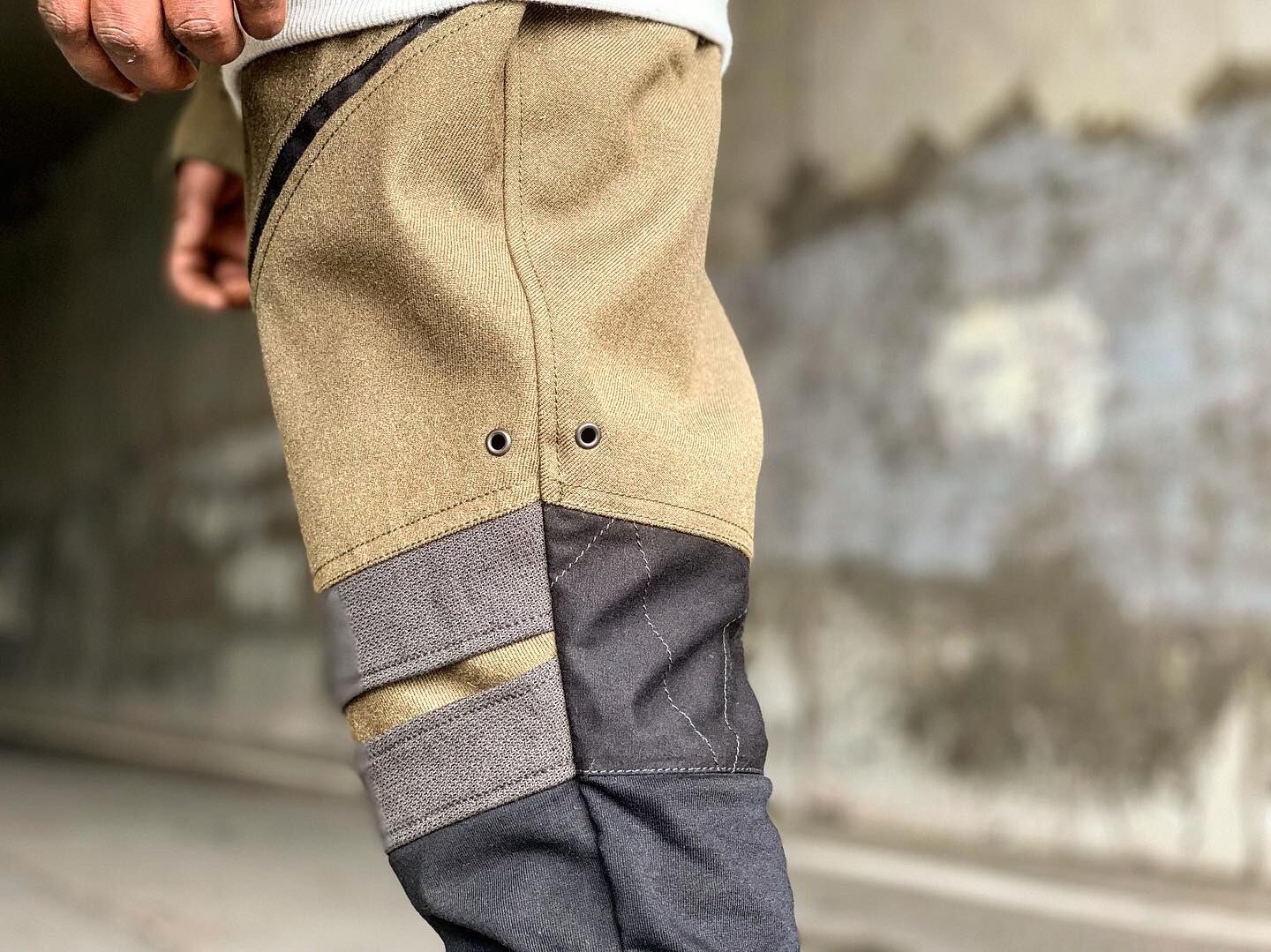 FURYの考案するニッカーボッカーズとは、ゆとりのある太腿部分に広めで深めに設計されたラウンド脇ポケット、膝の動きにのみストレッチが効くように生地を斜めに組み合わせ開閉するように構成した膝パーツ、ふくらはぎにフィットするように伸縮性のある綿100%のディマリアジャージーを組み合わせたジョッパーズパンツのシルエットを参考にしオランダ移民が愛したニッカーボッカーズに独自の理念を落とし込んだFURY定番パンツになります。(ディマリアジャージーとはボルテックス精紡で撚られたMVS糸を使用し、経年による毛羽立ちを抑え極限まで目を詰まらせた表面の美しさ、ハリコシを備えた一級品です。)