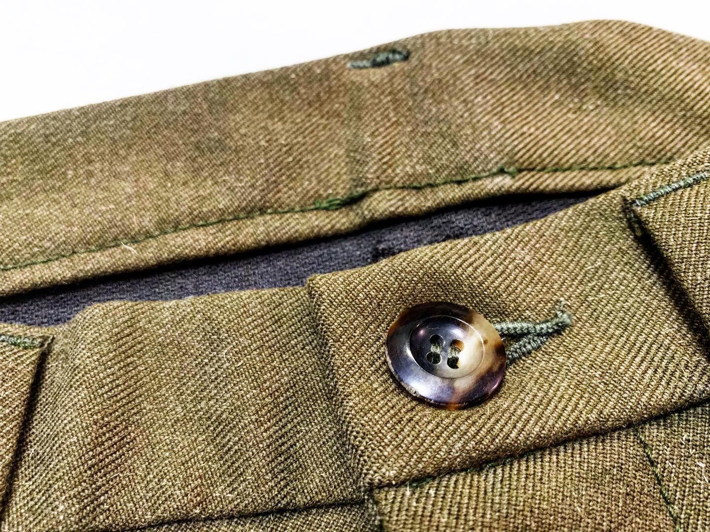 フロントは水牛の角を削って作られたボタンを使用し、後ポケットには光沢のあるブラックのドットボタンを選びました。