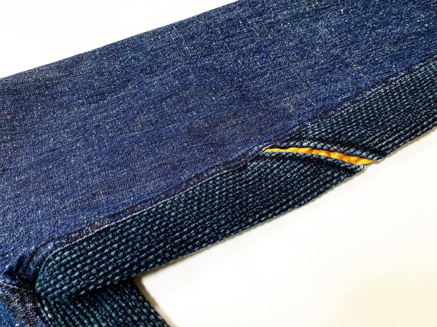 別布にインディゴ刺し子生地を使う事で経年変化を考え設計しており前帯部分には麻糸で刺し子ハンドステッチ、脇部分にはアウェイクニングオレンジ生地を組み合わせ機動性、差し色としてデザインしました。
