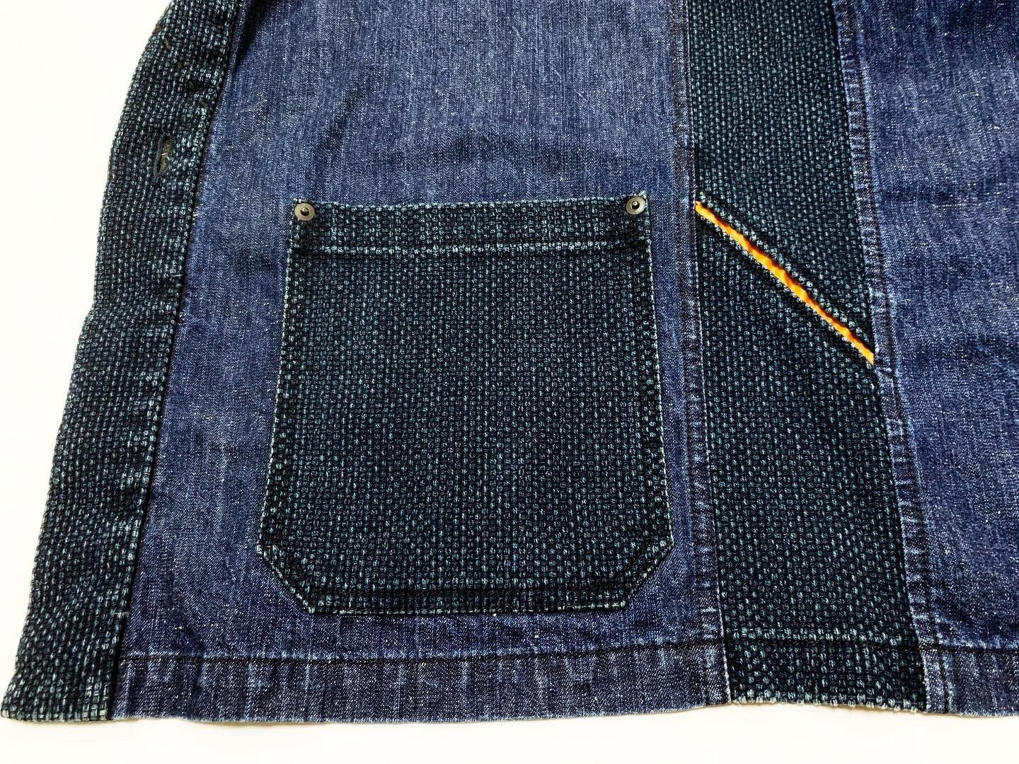 It is designed considering secular change by using Indigo Sashiko fabric as a separate cloth, and the sashiko hand stitch with hemp thread is used for the front part, and the awakening orange fabric is combined for the side part to design for mobility and color.