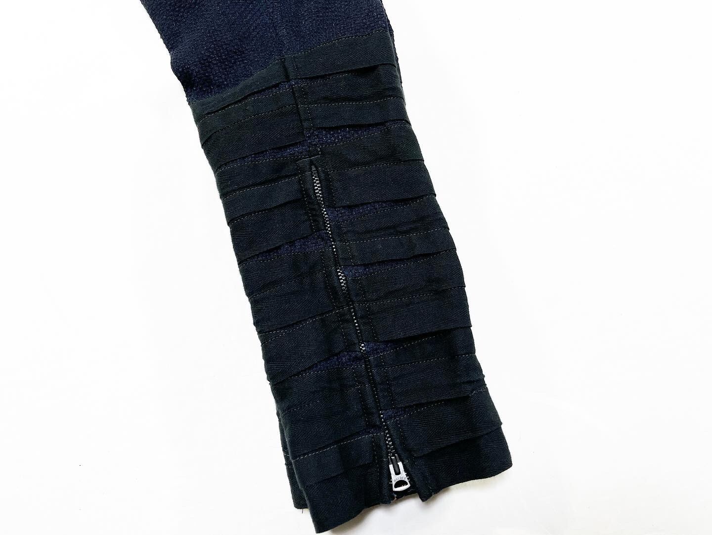 作品説明 : インディゴ染料にてロープ染色した糸で織られた綿100%の刺し子生地とリネン混のインディゴデニムを使用した脚絆ワンタックブリーチーズパンツなります。