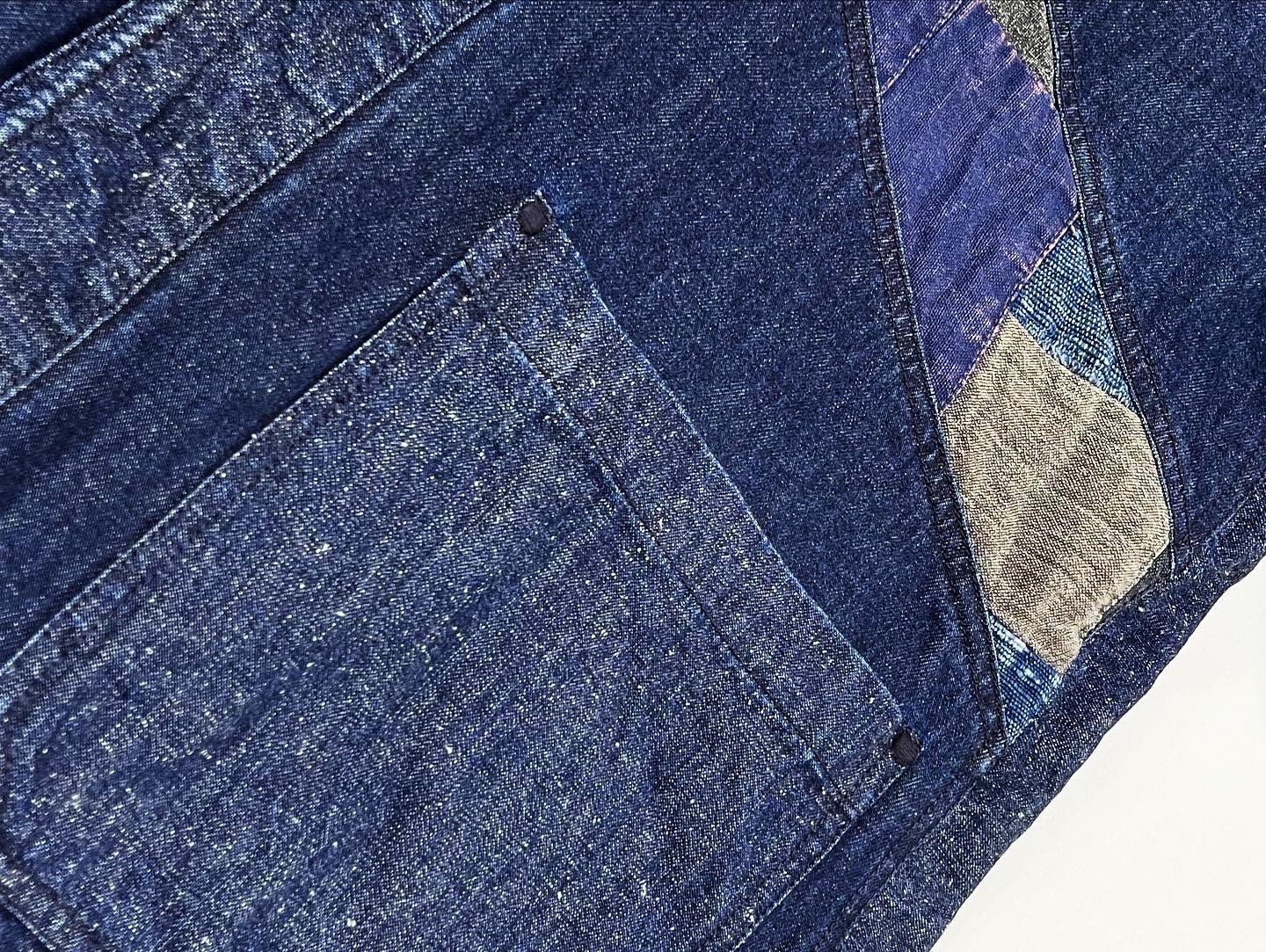 別布で古布をパッチワークしたインディゴ素材、袖部分にインディゴ刺し子生地、ポケットや脇部分にネップデニム生地を組み合わせております。