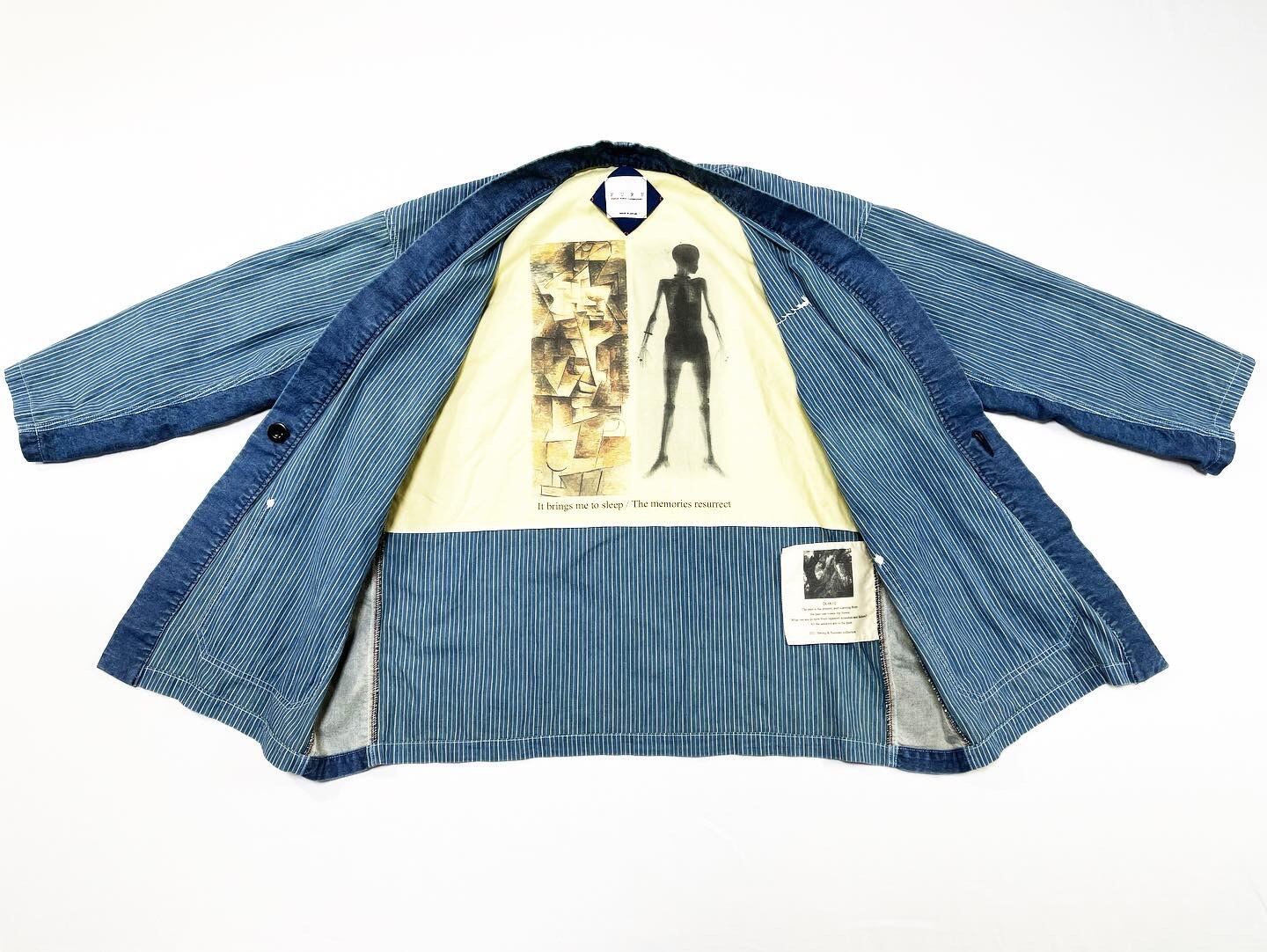 作品説明 : インディゴ染料にてロープ染色した糸で織られた綿100%のインディゴストライプ生地と糸を作る過程で生じる「落ち綿」を混紡した「ラフィー糸」で織られたインディゴデニムを組み合わせた着物シャツになります。