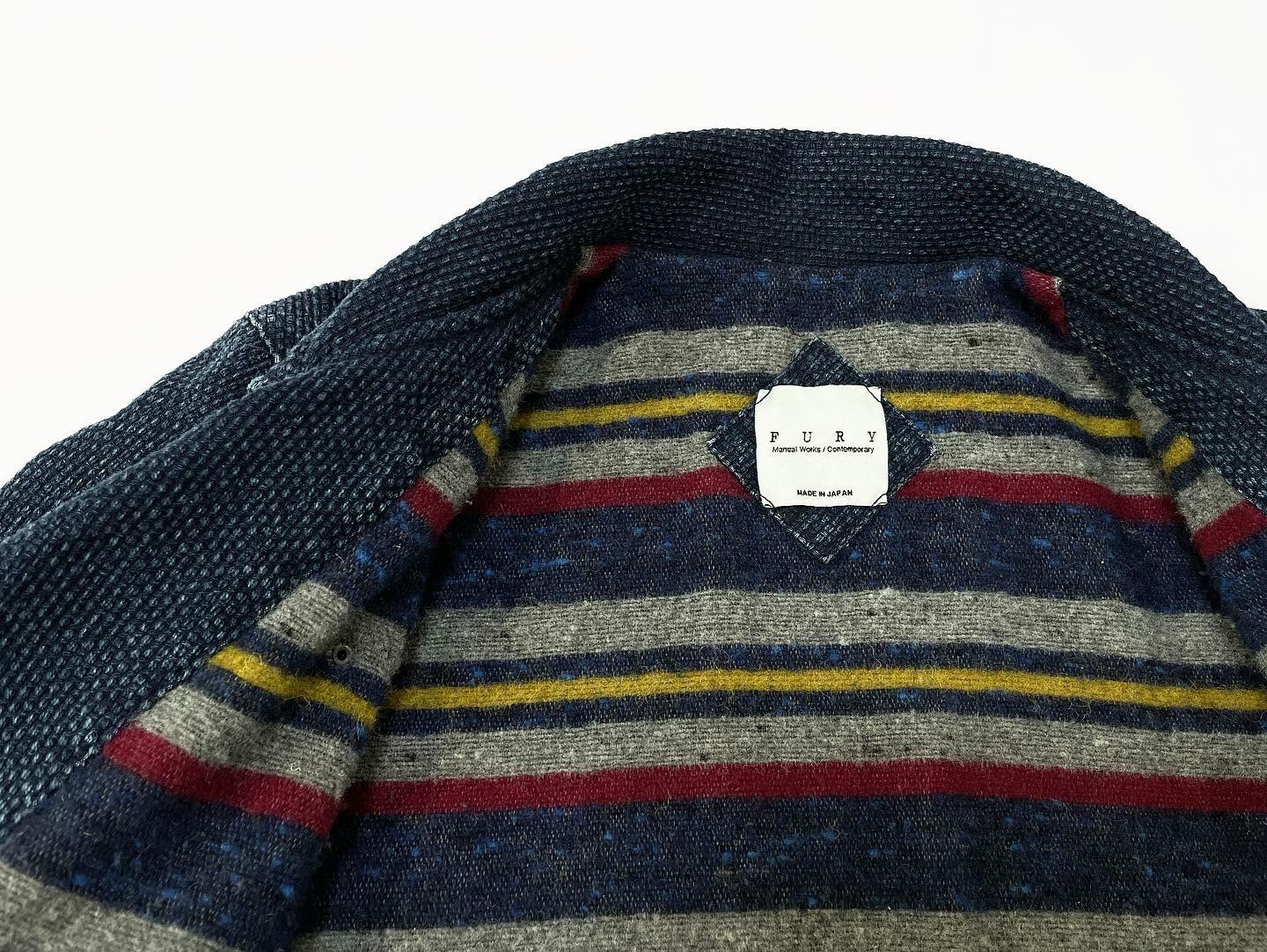 作品説明 : インディゴ染料にてロープ染色した糸で織られた刺し子生地で構成されたライダースジャケットになります。