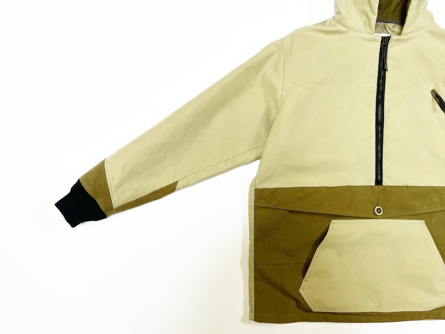 作品説明 : エジプトで栽培されている超長繊維綿であるギザコットンを高密度に織り上げ、モールスキン加工を施した素材を配色で組み合わせたアノラックパーカーになります。