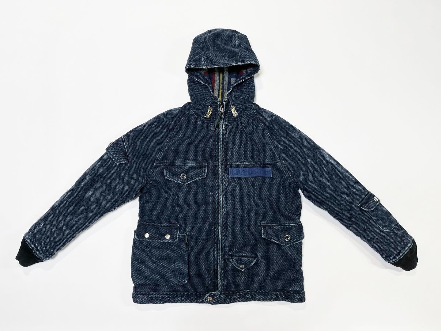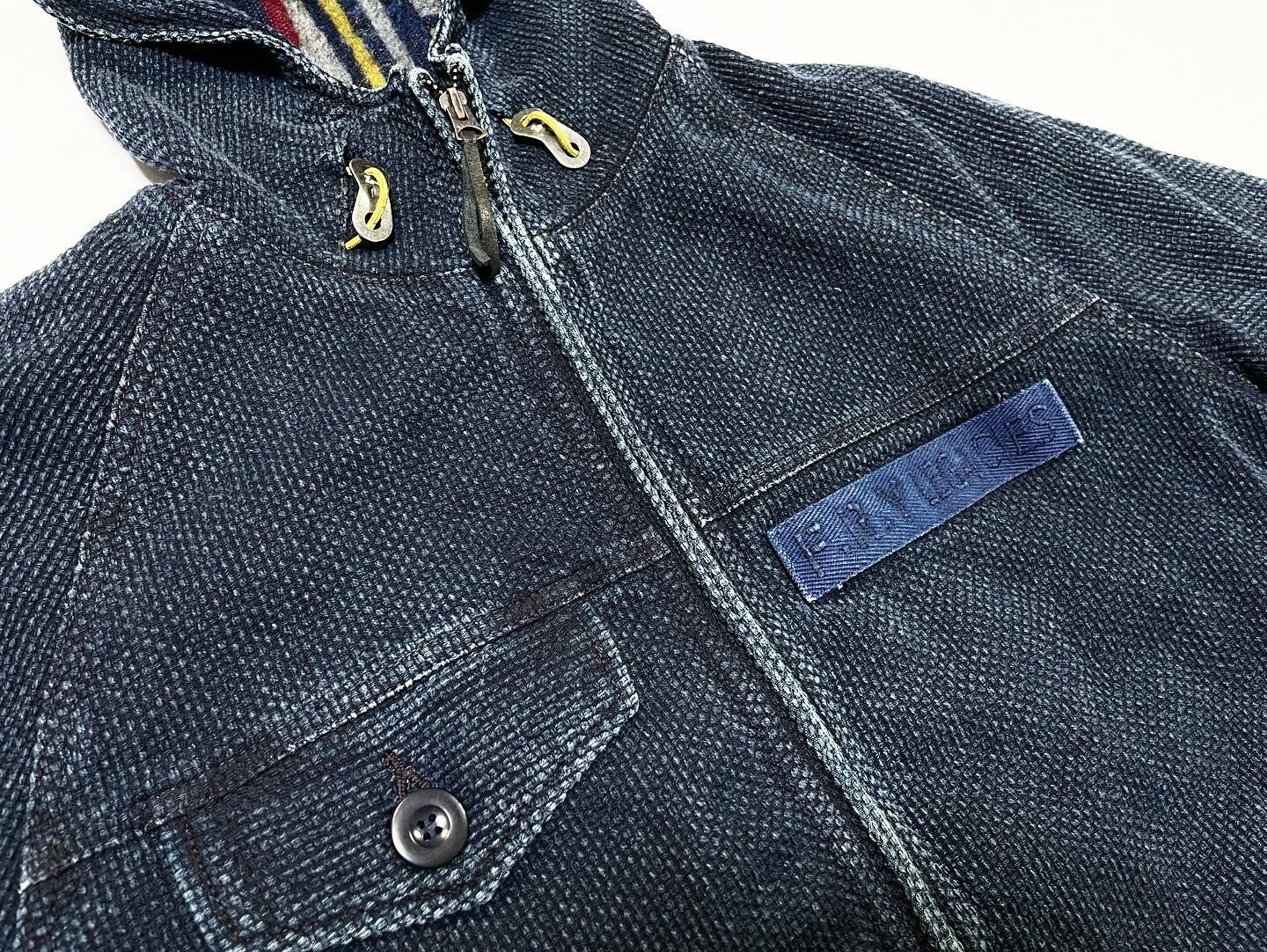 作品説明 : インディゴ染料にてロープ染色した糸で織られた綿100%刺し子生地で構成されたハンティングジャケットになります。