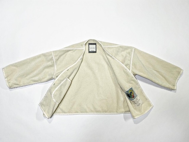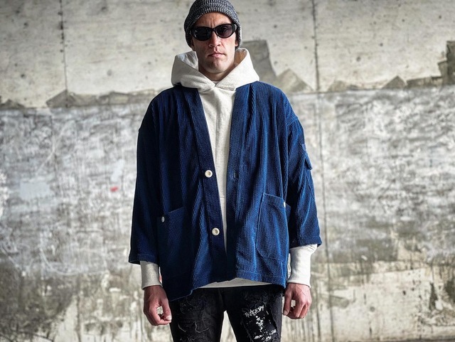 作品説明 : インディゴ染料で生地染めした6ウェルの綿100%エアータンブラーコール天生地を使用したライナー付き着物型ジャケットになります。