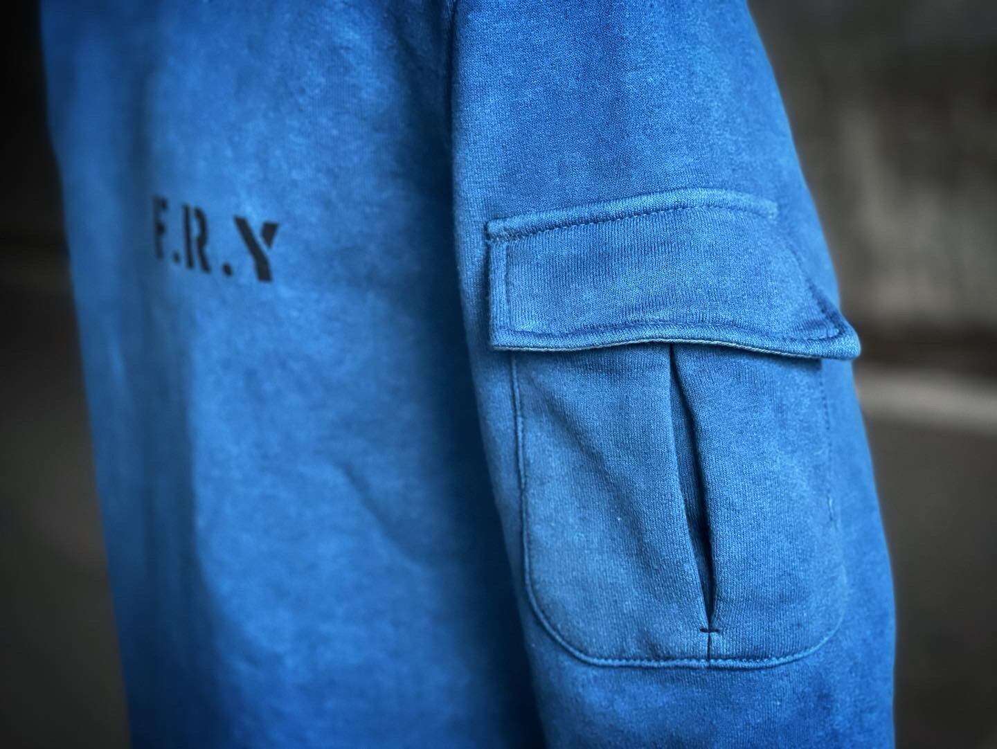 前身頃にカンガルーポケット、脇にはfuryの家紋ロゴを総柄袋布で構成したシームポケット、そして最大の特徴は左袖の深くマチを備えたファティーグポケットです。