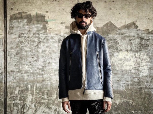 作品説明 : 天然藍染めしたジビエ鹿レザーを使用したシングルライダースジャケットになります。