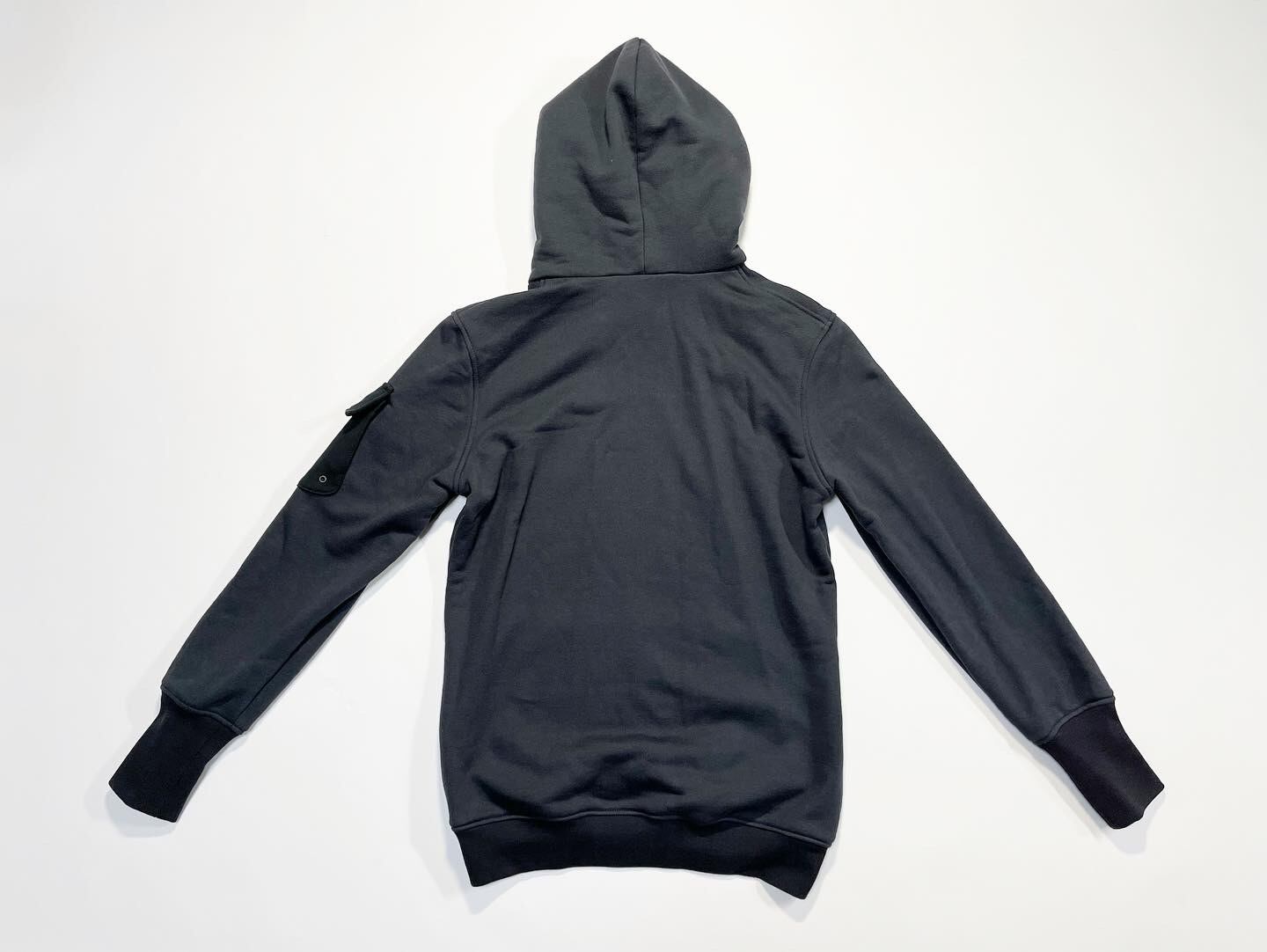 前身頃にカンガルーポケット、左袖の深くマチを備えたファティーグポケットをデザインしてます。