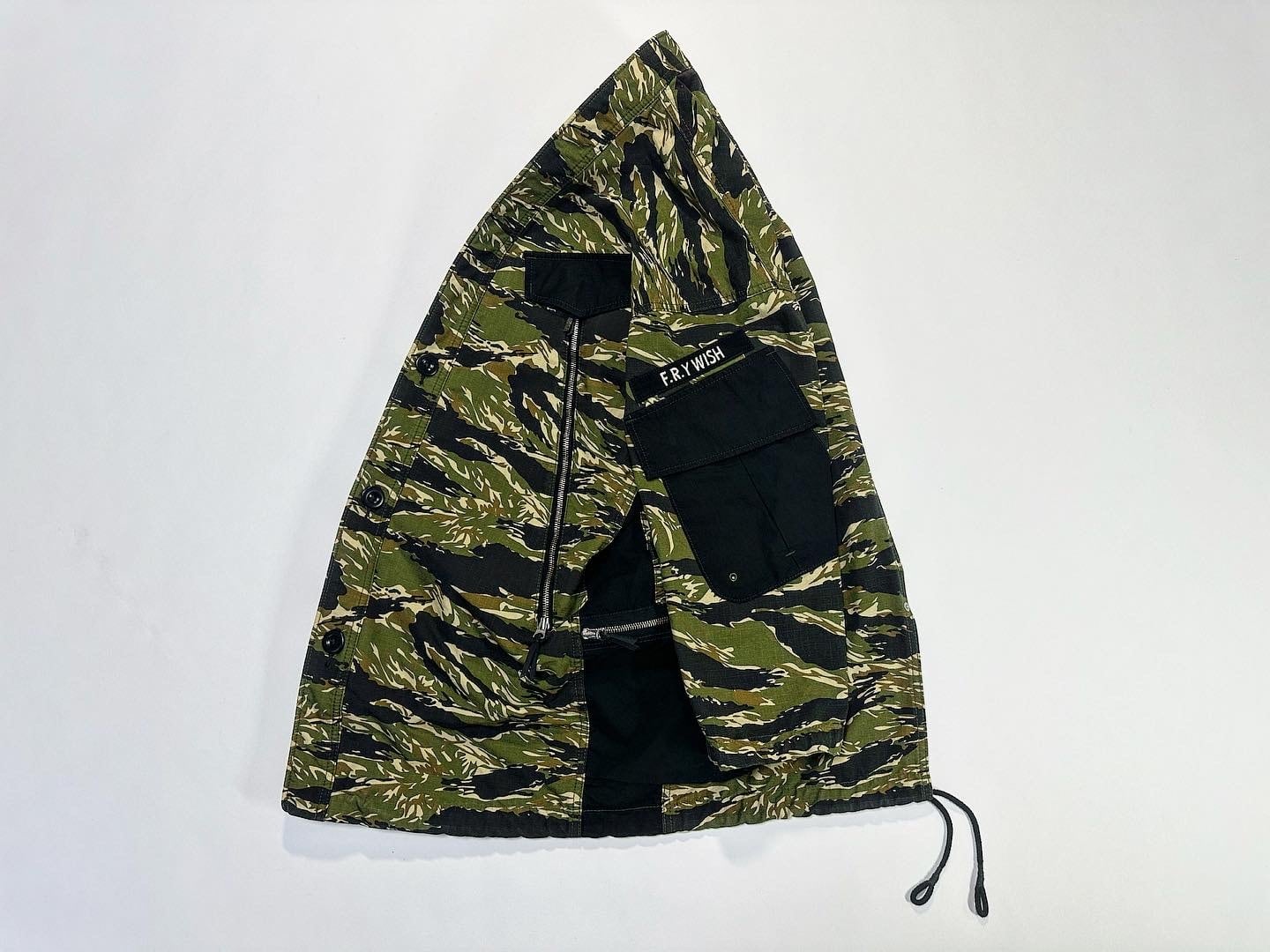 作品説明 : 綿100%のリップストップ生地にタイガーカモフラージュを総柄プリントした生地を使用した着物型のシャツになります。