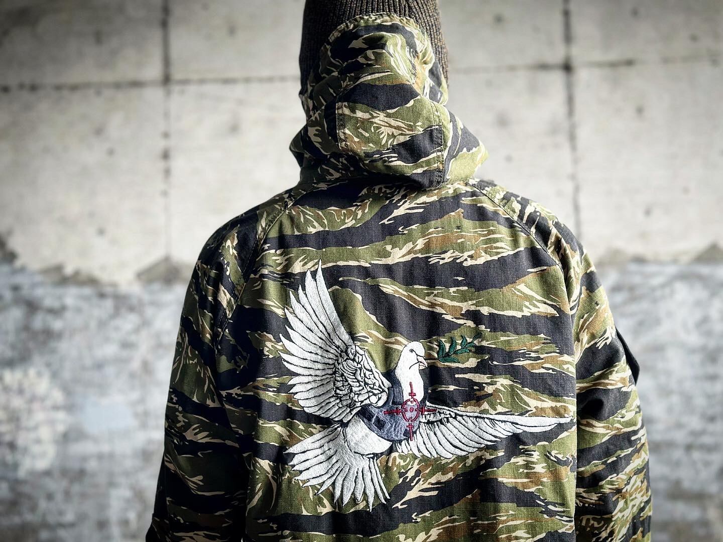 後見頃に横振り刺繍職人《尾崎史奈》 @fumi.fumina 様にバンクシー が描いた平和の象徴を立体的に描いて頂きました。