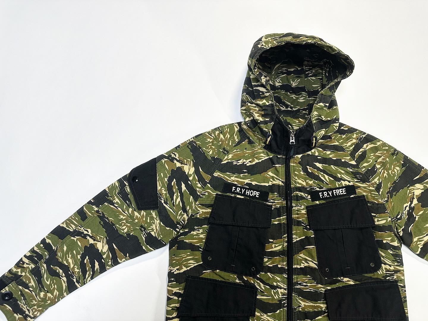 作品説明 : 綿100%のリップストップ生地にタイガーカモフラージュを総柄プリントした生地を使用したユーティリティジャケットになります。