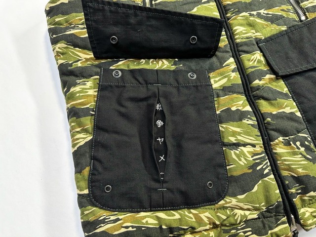 作品説明 : 綿100%のリップストップ生地にタイガーカモフラージュを総柄プリントした生地を使用したキルティングベストになります。