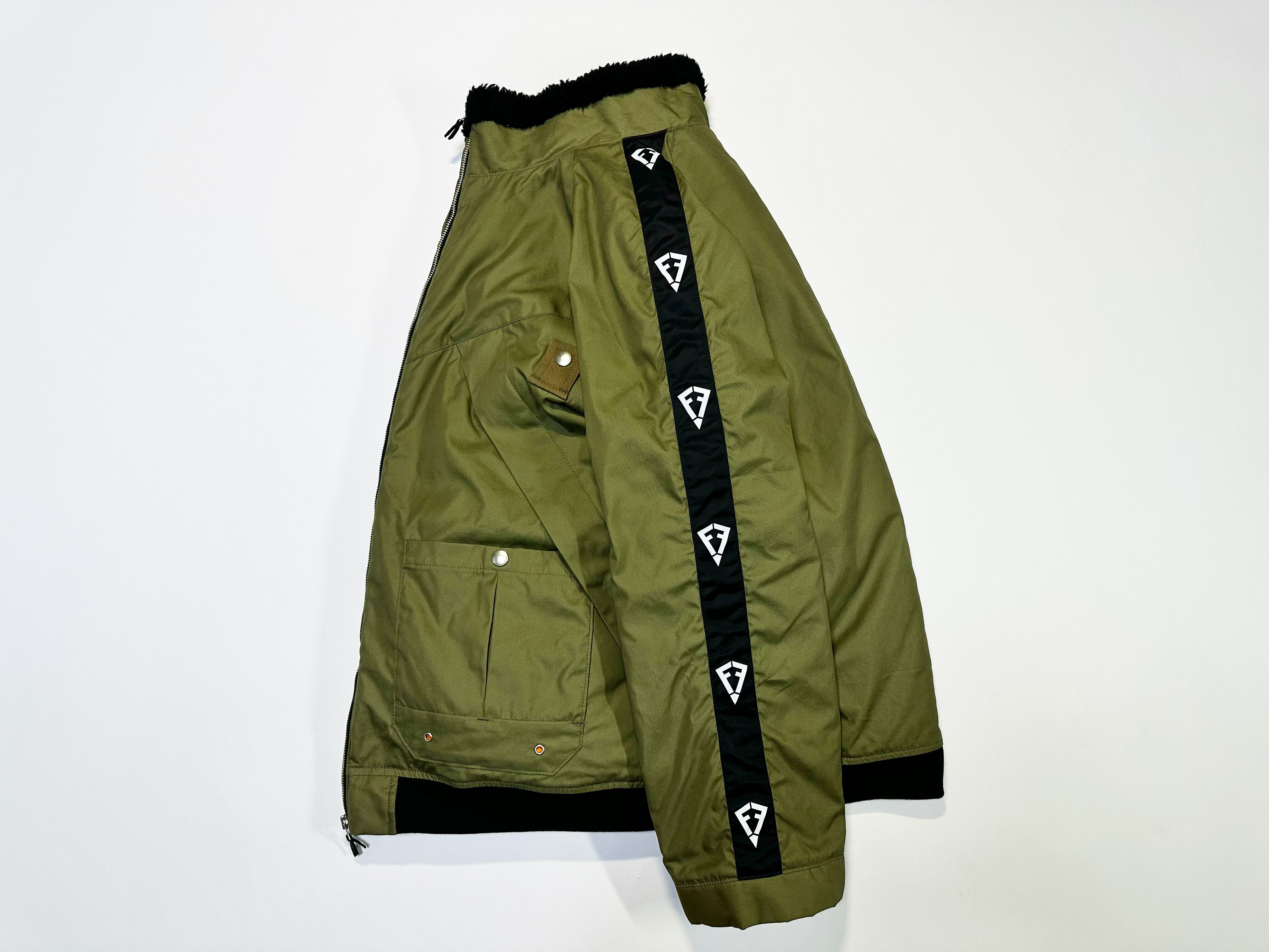 袖部分にはシレー加工ナイロンナイロンツイルを剥ぎ合せ今季エンブレムロゴを等間隔で圧着プリントしております。