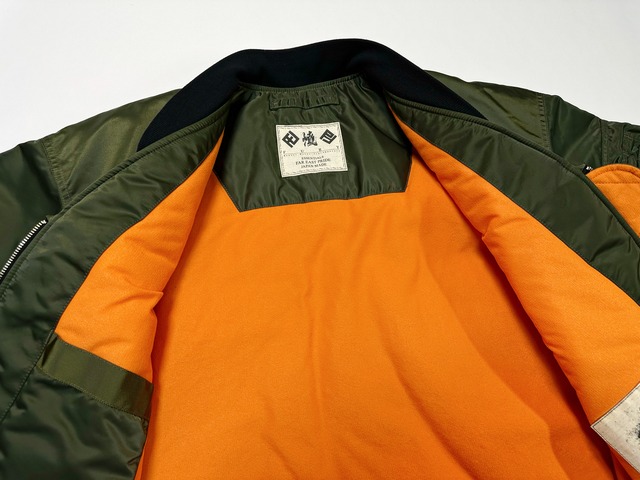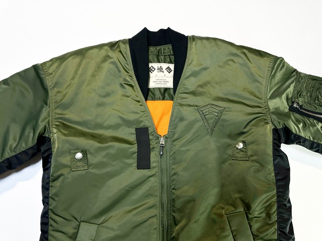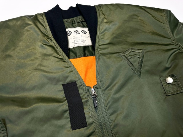 作品説明 : シレー加工されたミリタリーナイロンツイル生地を使用し、日本独自の文化《半纏》を原型としたフライトジャケットになります。